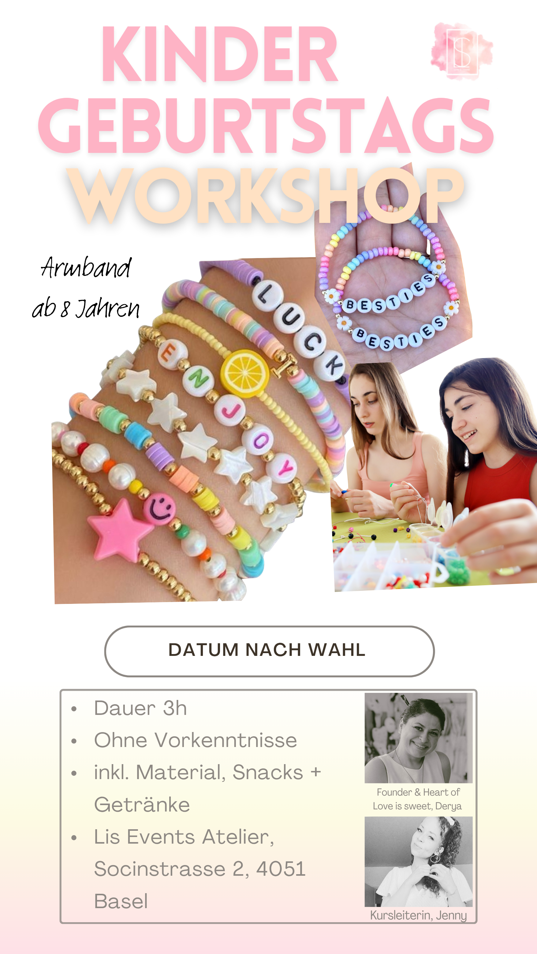 In unserem liebevoll gestalteten Atelier in Basel feiern bis zu 8 Kinder ab 6 Jahren ihren ganz besonderen Tag. Gemeinsam kreieren sie ihre eigenen Armbänder, Ketten oder Schlüsselanhänger, mit bunten Perlen, Buchstaben-Beads, Charms, Glitzer und vielen Farben. Jedes Kind nimmt am Ende mehrere selbstgemachte Schmuckstücke stolz mit nach Hause.